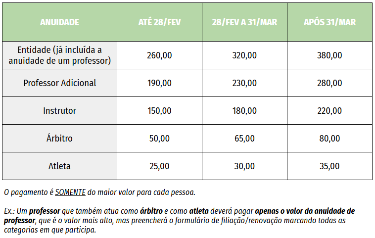 Somente receberão as documentações e poderão participar dos treinos da FGKW e da CBKW, assim como de outros eventos na condição de filiados, as Entidades, Professores, Instrutores, Árbitros e Atletas, que estiverem adimplentes com o pagamento da anuidade à FGKW. Somente serão aceitas anuidades de professores, instrutores e atletas quando a anuidade da respectiva Entidade já estiver paga.